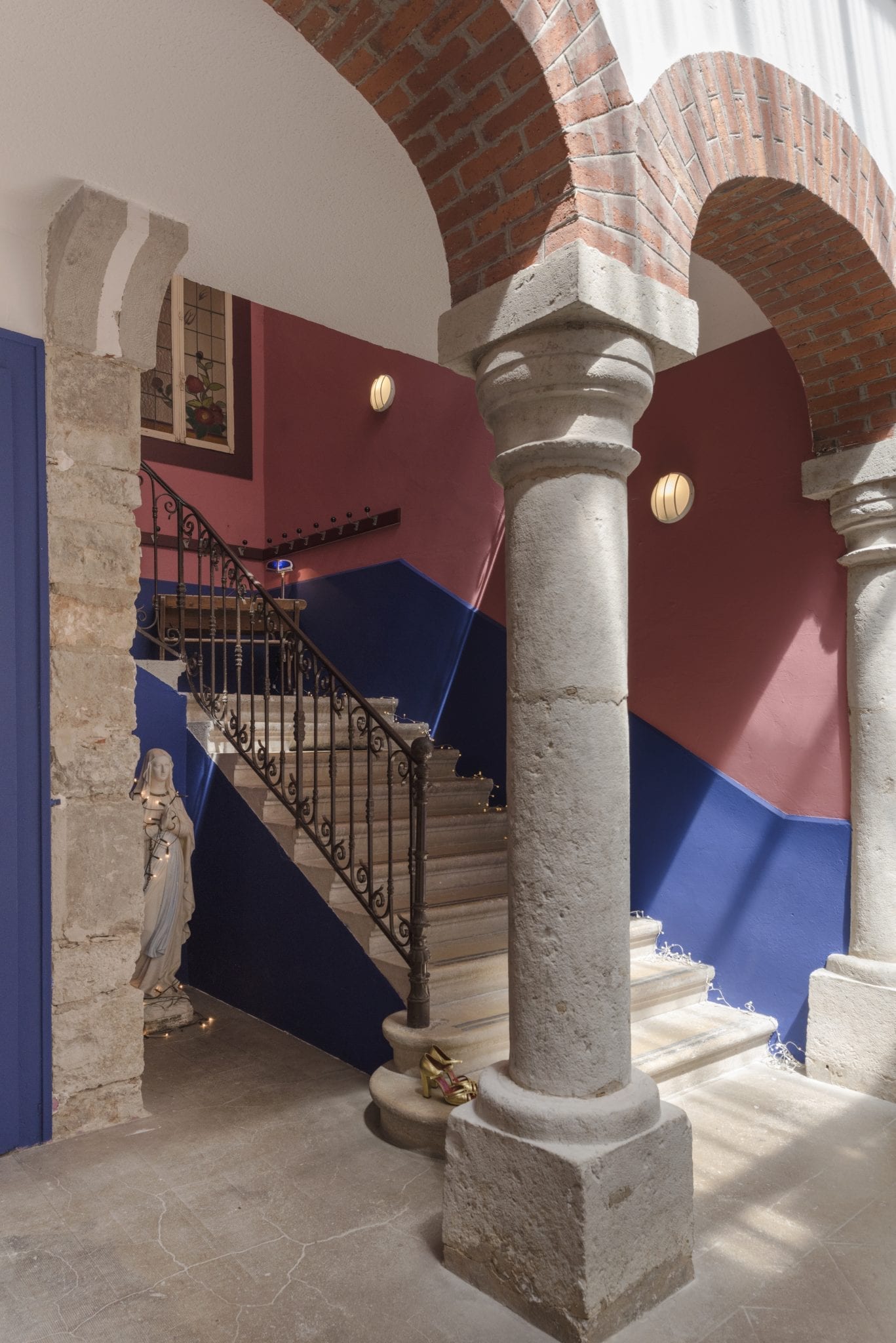 Une bâtisse de 1870 aux pierres blanches. A l’intérieur, de belles pièces de vie lumineuses avec murs clairs, parquet. Chaque classe est transformée en chambre avec sa salle de bains. A l’extérieur, on retrouve une architecture avec des colonnes, des voutes qui ornent le patio à ciel ouvert, la cour de l’école.