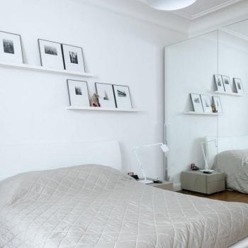 Mobilier Le Corbusier pour cet appartement classique Haussmannien situé dans le 17ème arrondissement de Paris. Pièces de vie lumineuses, parquet chevron, murs blancs.
