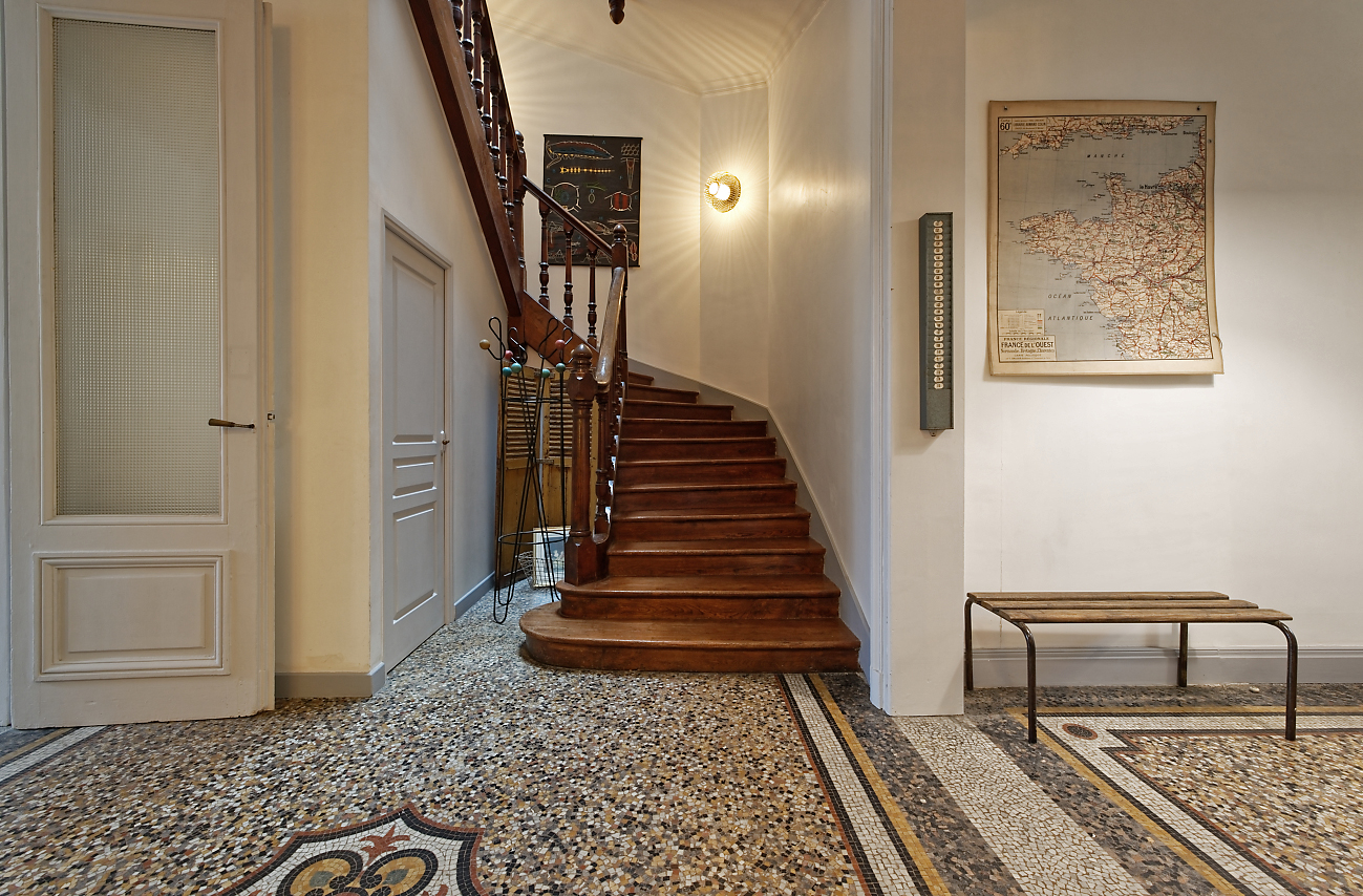 murs peints couleurs, parquet, carrelage/tomettes, hauteur sous plafond, rénovation, ancien