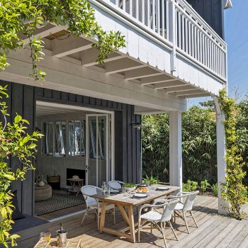 à l’extérieur, une belle façade colorée bleue, une large terrasse en bois, un jardin végétalisé
