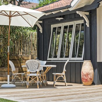 A l’extérieur, une façade en bois une terrasse en bois sous les pins, un espace engazonné. idéal shooting photo intérieur/extérieur linge de maison, mobilier, décoration, mode …