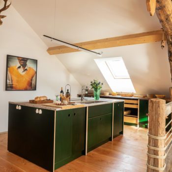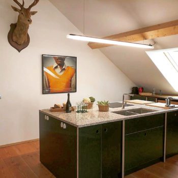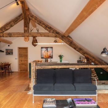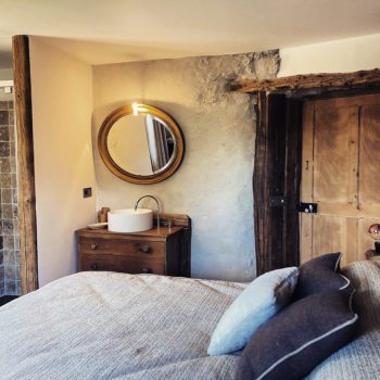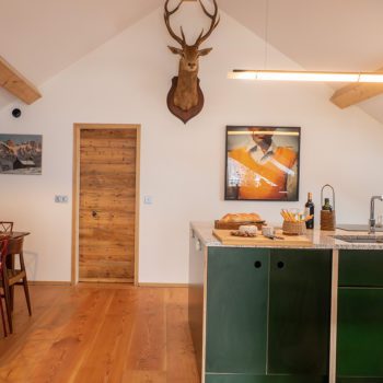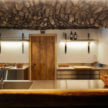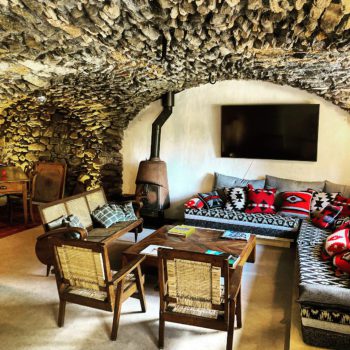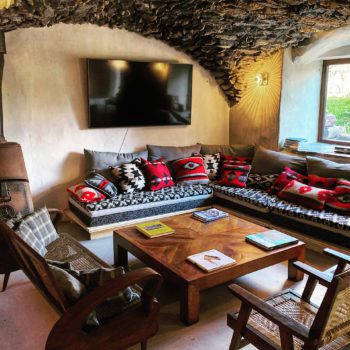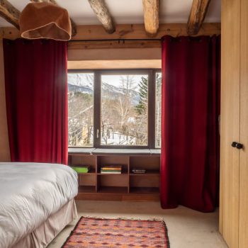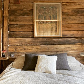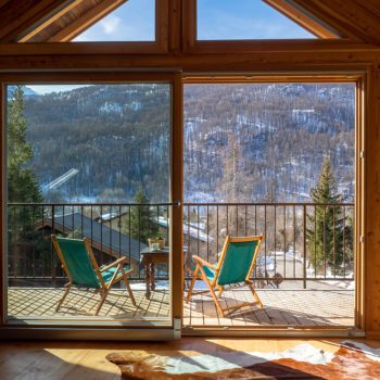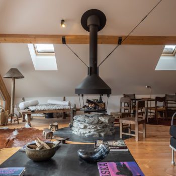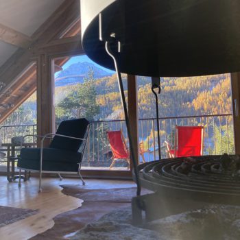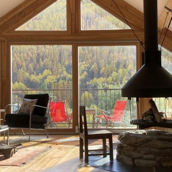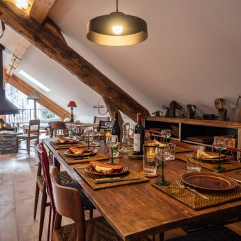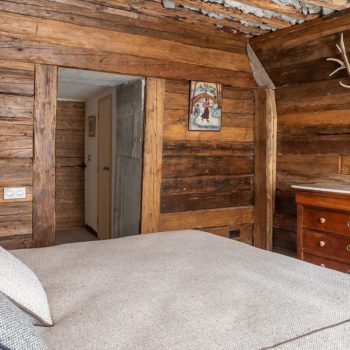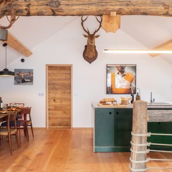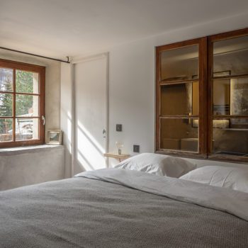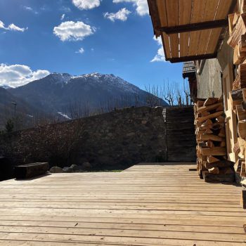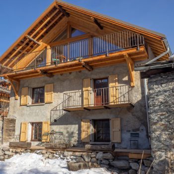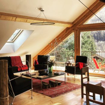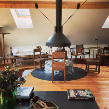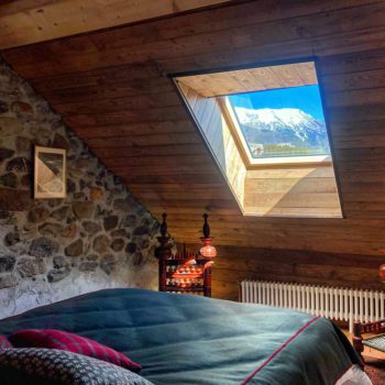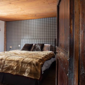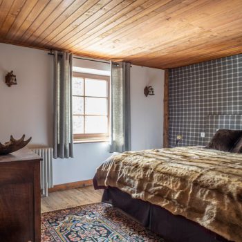 Cet ancien chalet bénéficie d’un aménagement contemporain. La grande pièce de vie avec une cheminée centrale occupe le dernier étage avec vue sur les montagnes, les nombreuses chambres se répartissent dans les étages inférieurs et le rdc accueille un grand espace bar/salon/salle à manger en pierres grises.
