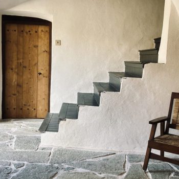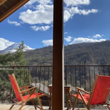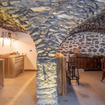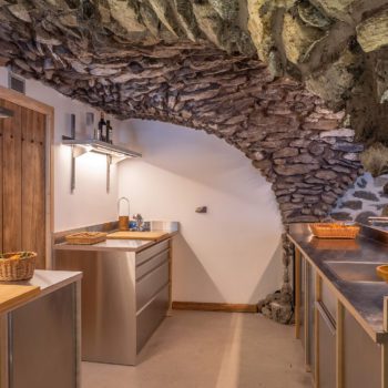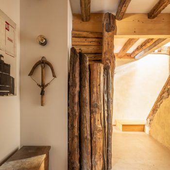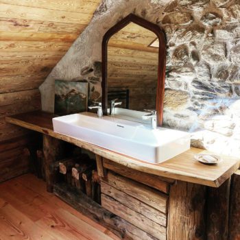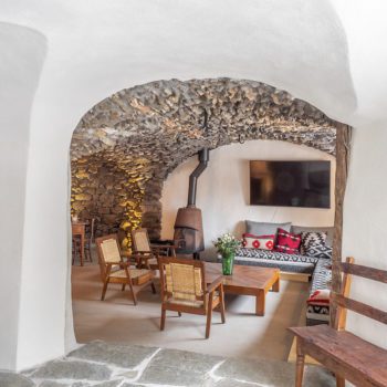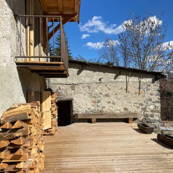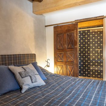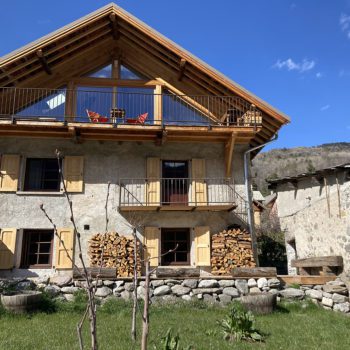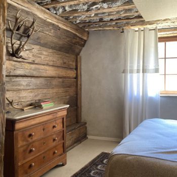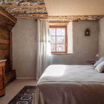This former chalet has a contemporary layout and a neat decoration. The large living room with a central fireplace occupies the top floor with views of the mountains, the numerous rooms are distributed in the lower floors and the ground floor hosts a large space bar/lounge/dining room in vaulted gray stones.