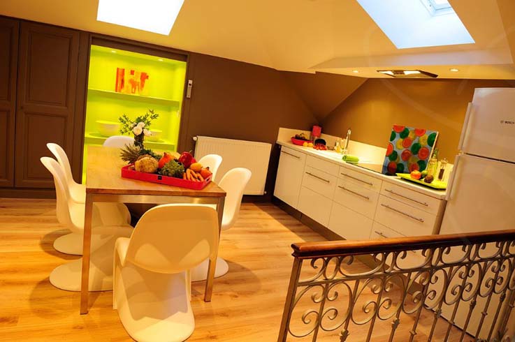 carrelage/tomettes, escalier, cheminée, hauteur sous plafond, parquet, haussmannien, murs peints couleurs, luminosité