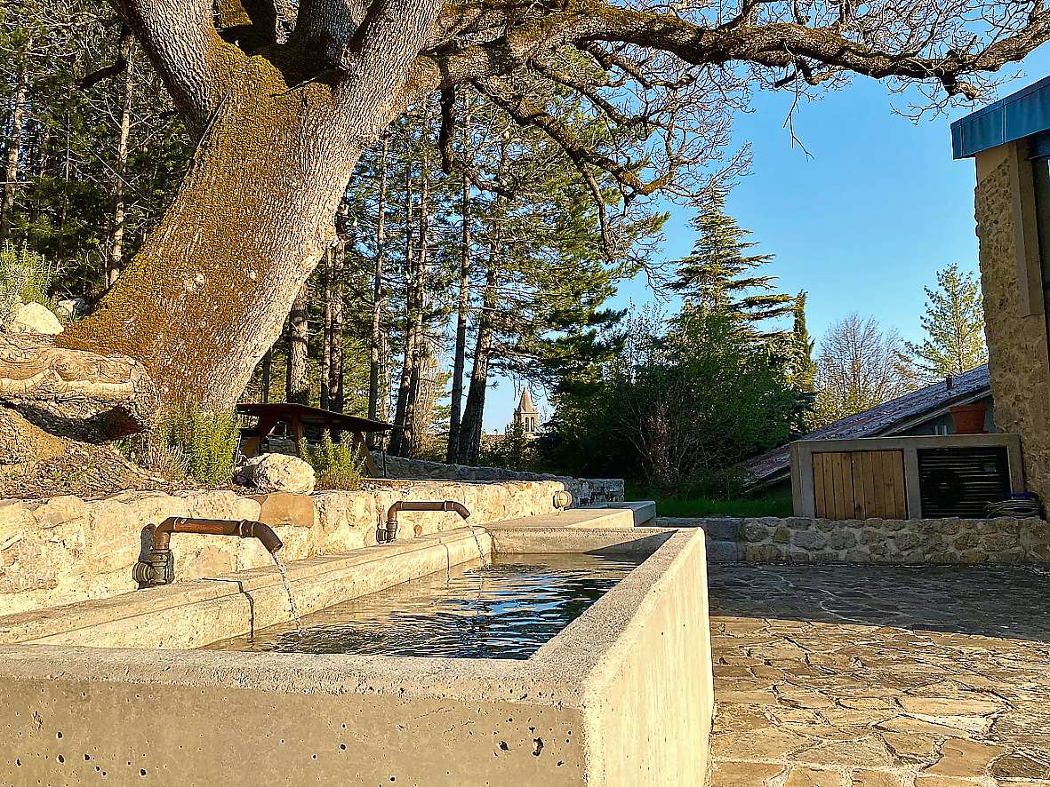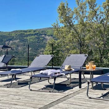 À l’extérieur, de belles terrasses aménagées terrasse bois, dallage en pierre locale, une piscine avec vue sur la montagne.