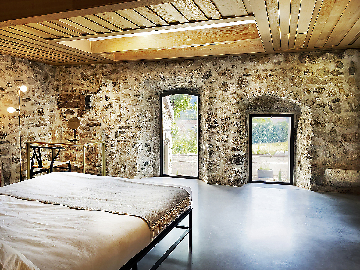 À l’intérieur de grands espaces avec de très beaux volumes lumineux, avec de larges ouvertures, mêlant différents matériaux bruts, anciens et très contemporains, des chambres claires et spacieuses à la décoration sobre et soignée.