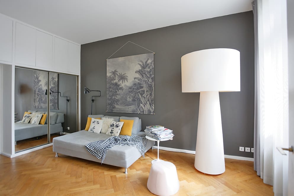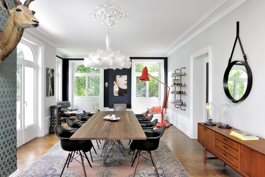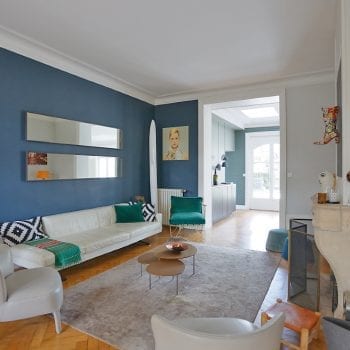 Renovated Maison de Maitre, in Charbonnières les Bains, near Lyon.Inside, beautiful volumes for living rooms, combining parquet, white walls, design furniture. The rooms are spacious, bright with colorful walls. Outside, a large swimming pool surrounded by a terrace in a large landscaped park.