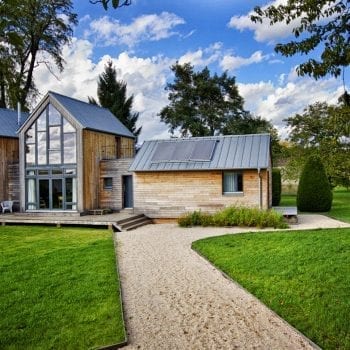 Maison bioclimatique au milieu du vignoble bourguignon. A l’intérieur, dominante bois clair pour les pièces de la maison et décoration sobre. A l’extérieur, façade bardage bois, larges baies vitrées, un jardin verdoyant, arboré, alternant pelouse, chemin gravillonné, arbustes taillés.