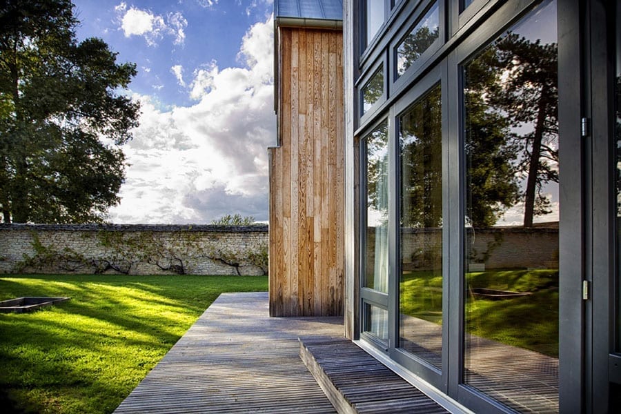 Bioclimatic house in the middle of the Burgundian vineyard. Inside, dominant light wood for the rooms of the house and sober decoration. Outside, facade wood cladding, large windows, a green garden, trees, alternating lawn, gravel road, shrubs cut.