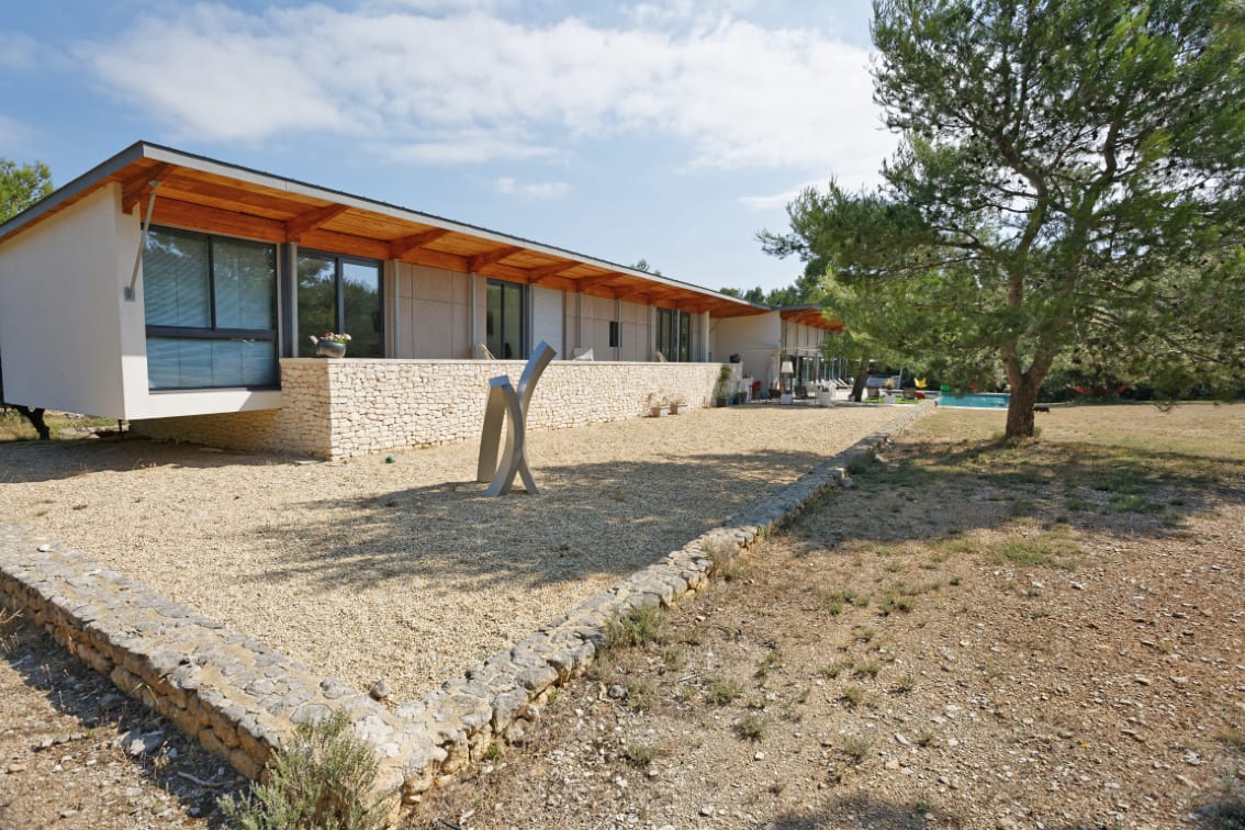Aux pieds des Alpilles, cette maison contemporaine est nichée au cœur d’une pinède… A l’intérieur, une très grande pièce de vie lumineuse donnant sur l’extérieur par de grandes baies vitrées. A l’extérieur, on trouve une terrasse en bois, une piscine et un grand jardin.
