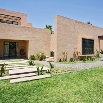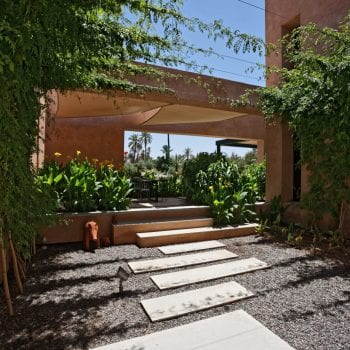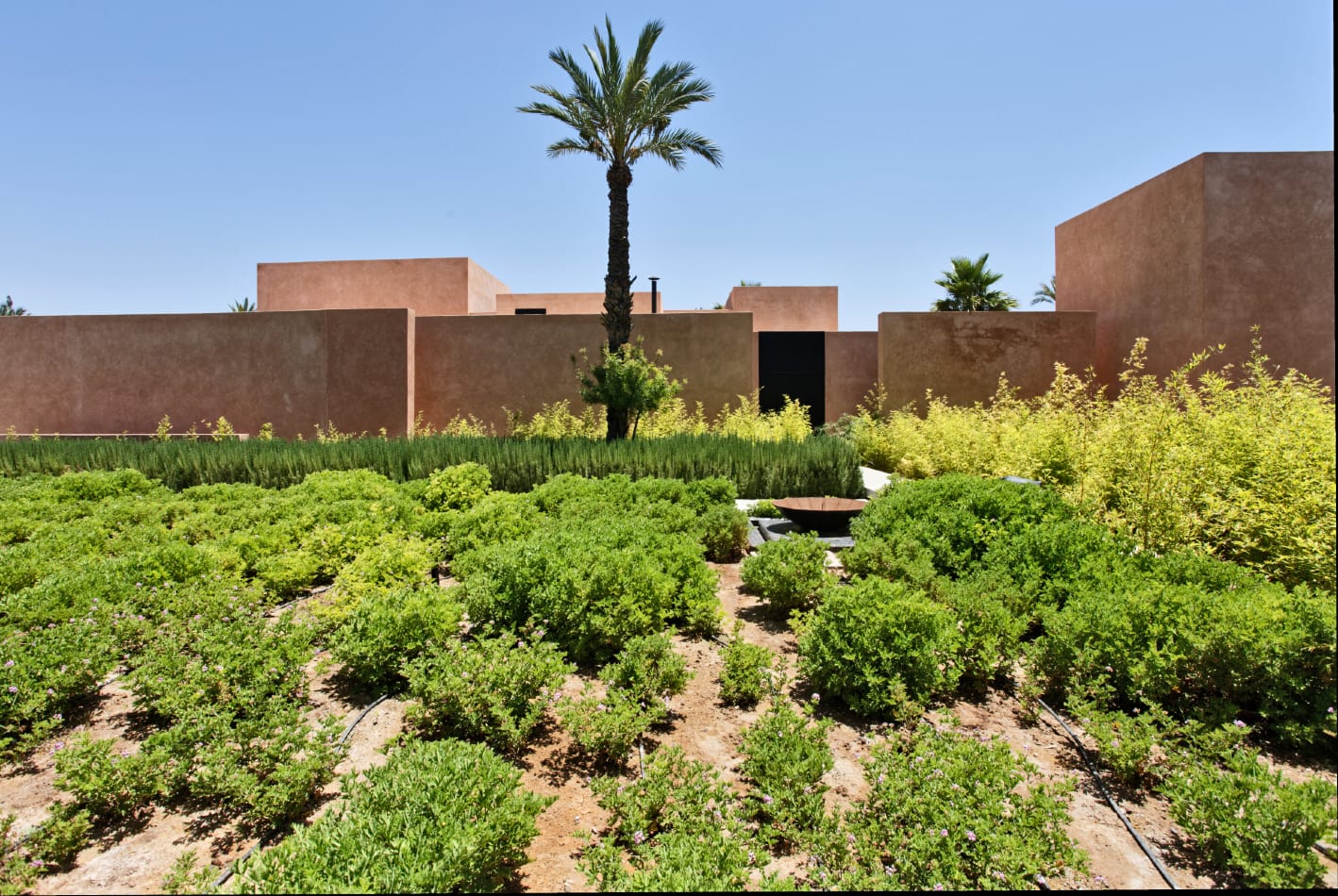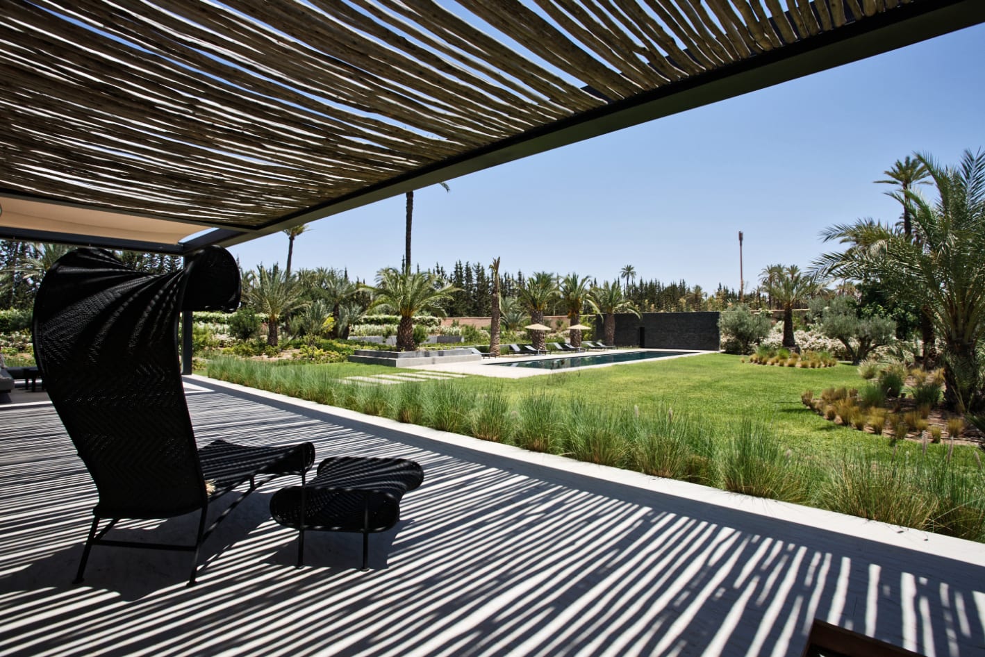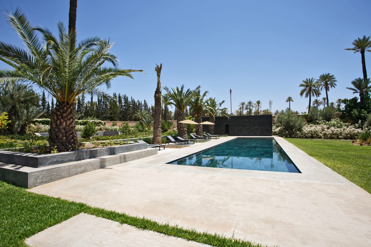 Maison contemporaine à Marrakech, murs extérieurs couleur terracotta. Mobilier, aménagements et matériaux contemporains, grandes baies vitrées, sols carrelages élégants. A l’extérieur, plusieurs terrasses abritées du soleil, un parc verdoyant, palmiers, pelouse, plantes méditerranéenne et une grande piscine agrémentée d’une belle terrasse.