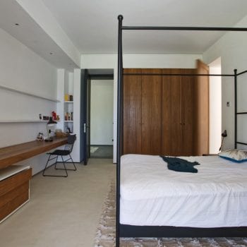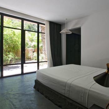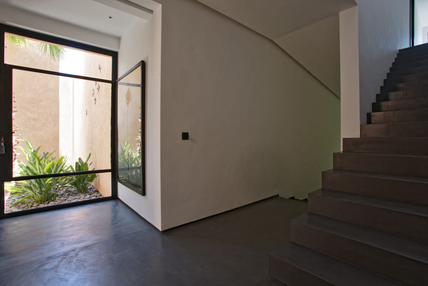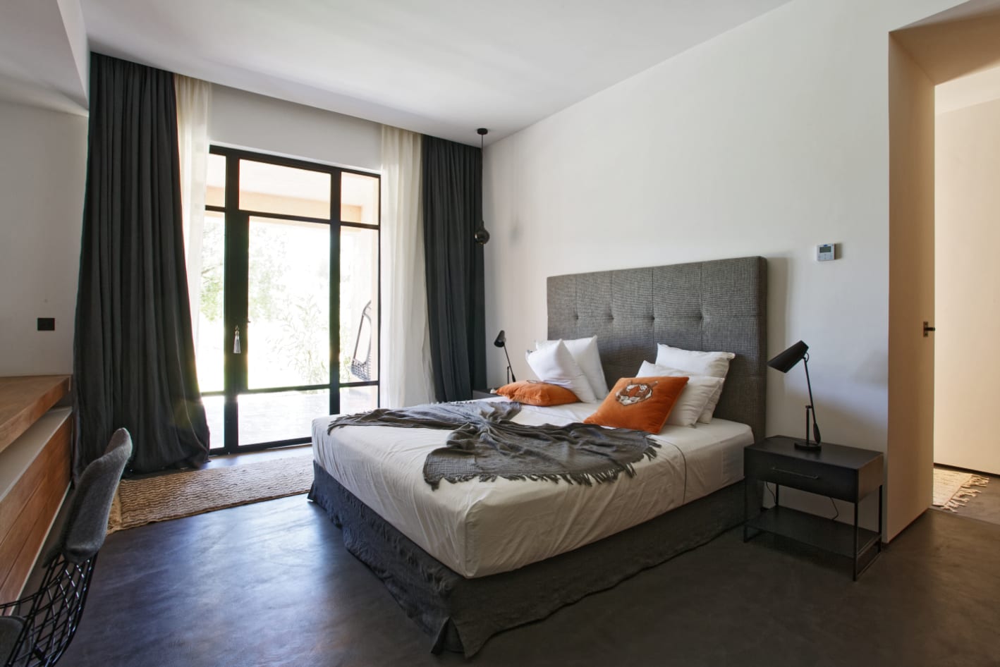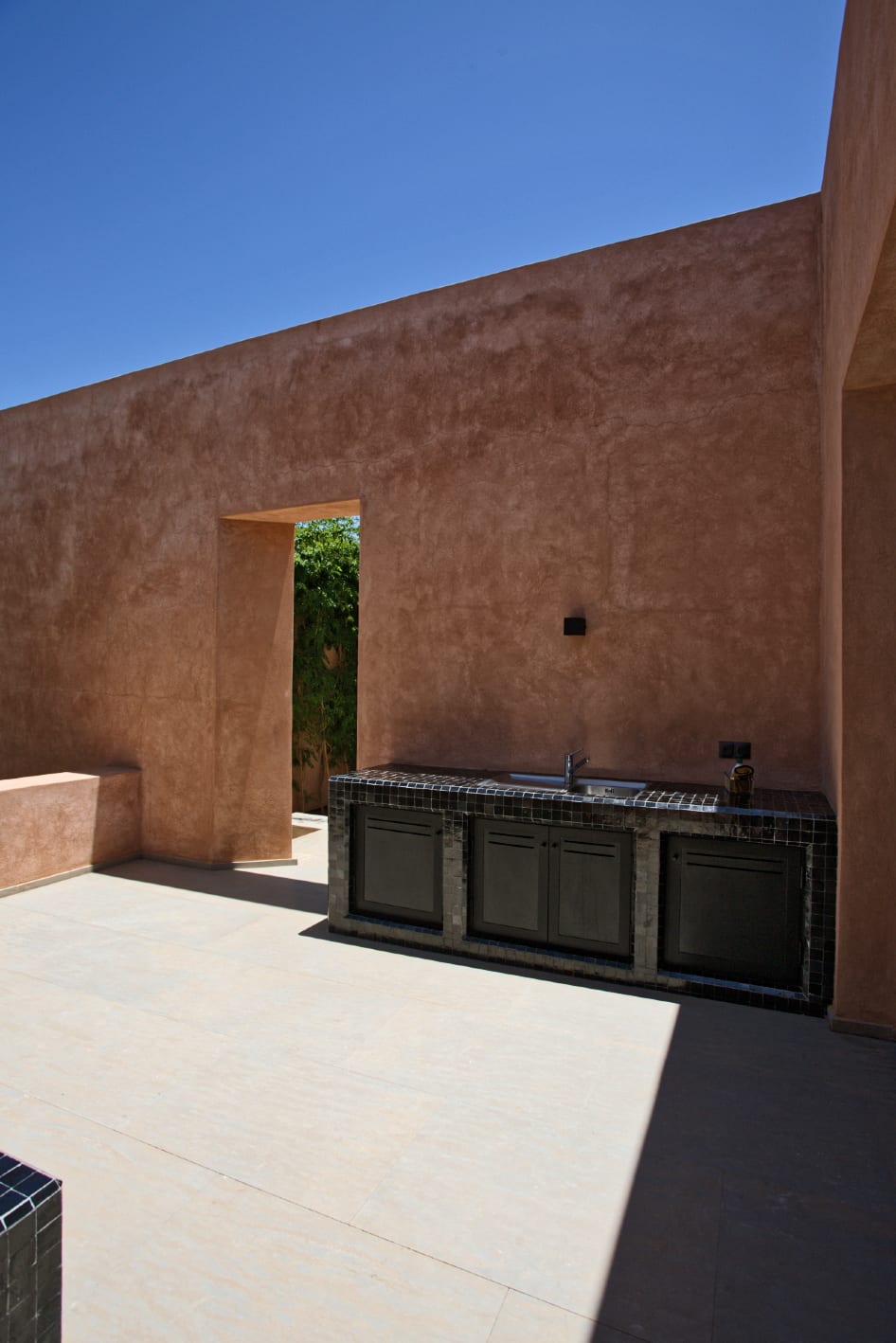 Maison contemporaine à Marrakech, murs extérieurs couleur terracotta. Mobilier, aménagements et matériaux contemporains, grandes baies vitrées, sols carrelages élégants. A l’extérieur, plusieurs terrasses abritées du soleil, un parc verdoyant, palmiers, pelouse, plantes méditerranéenne et une grande piscine agrémentée d’une belle terrasse.