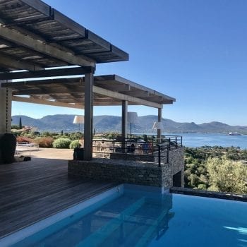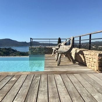 Contemporary house in Corsica. Nice finishes for this house that offer beautiful living rooms, a sober and neat contemporary decoration. Outside, a stone facade, many landscaped spaces, garden with trees and green, terraces, a large awning with sea view, infinity pool …