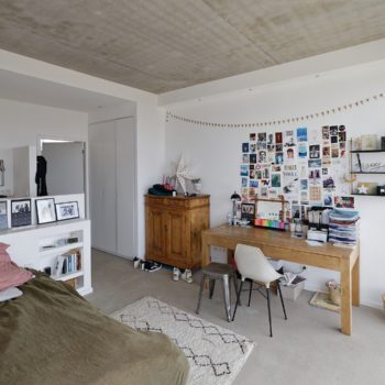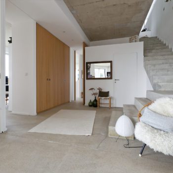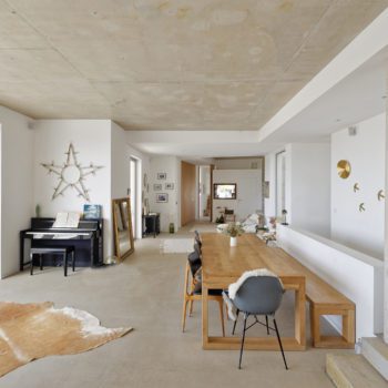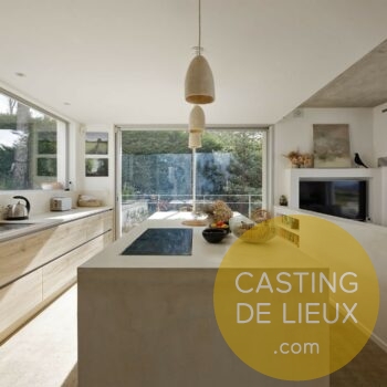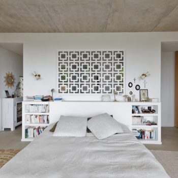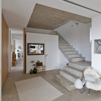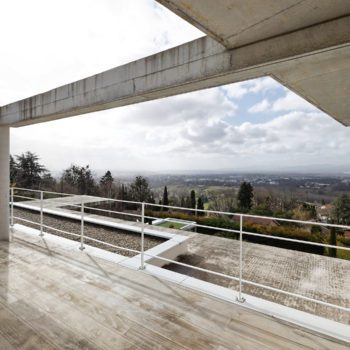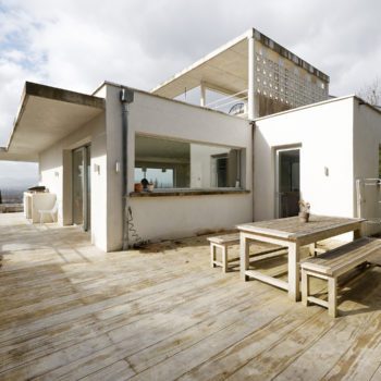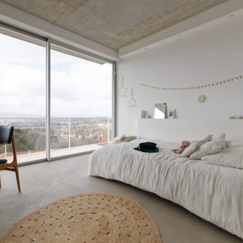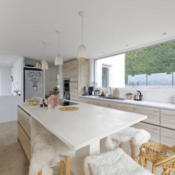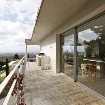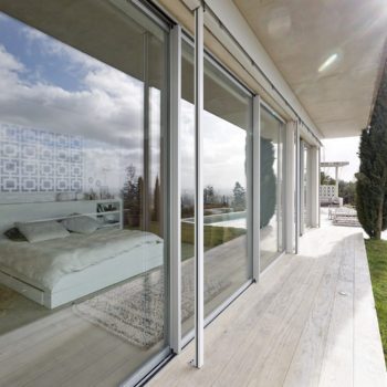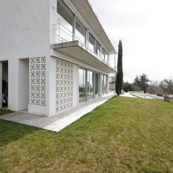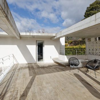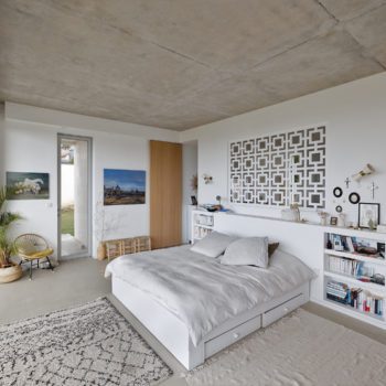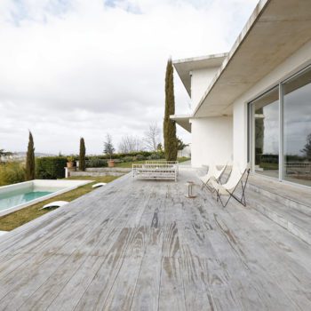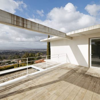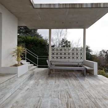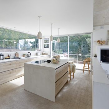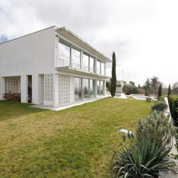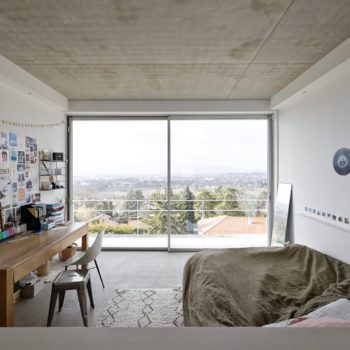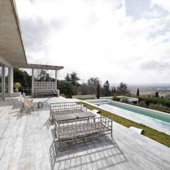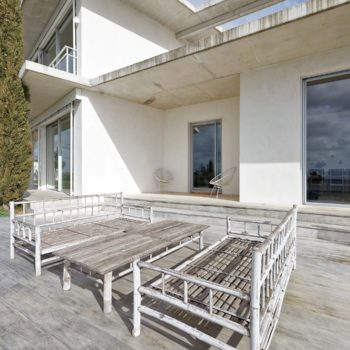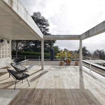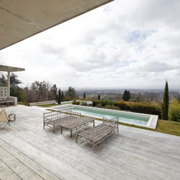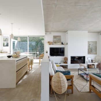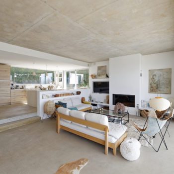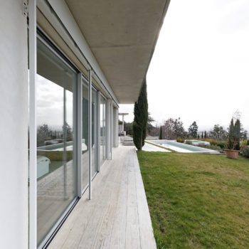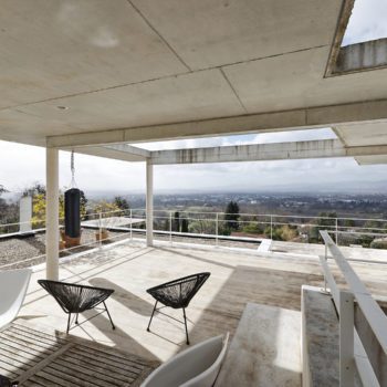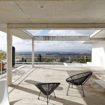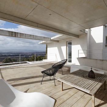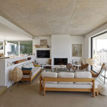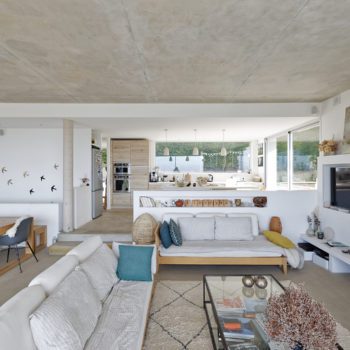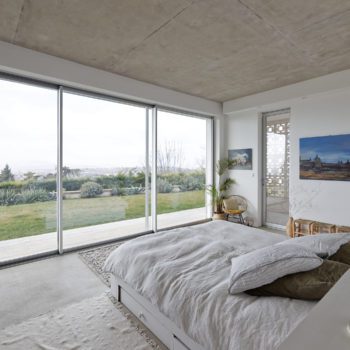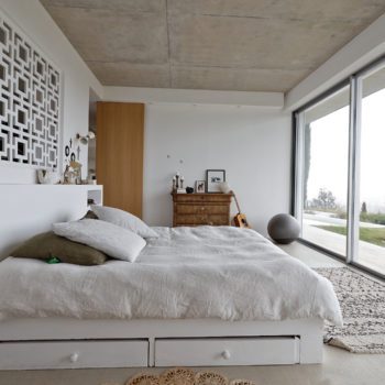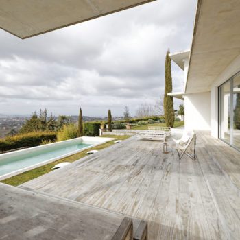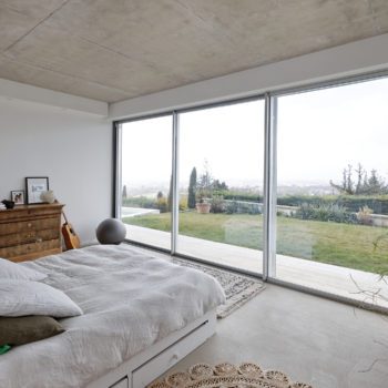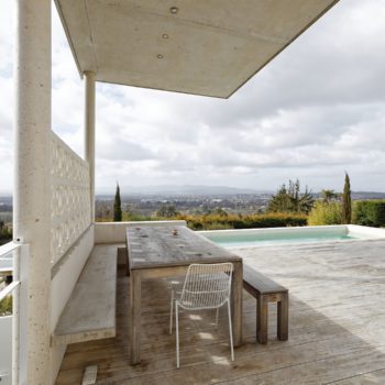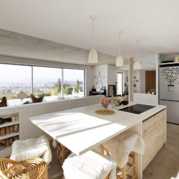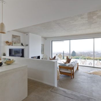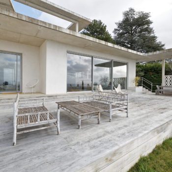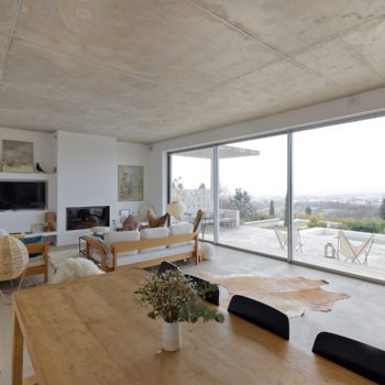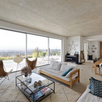 Raw and uncluttered materials, concrete from floor to ceiling, white walls, large bay windows where the sky and the golden mountains are reflected, and which totally open up this breathtaking architect’s house from the 70’s, entirely revisited, to the outside where the garden, the various fitted out spaces, with a view, welcomes a swimming pool