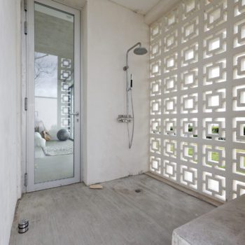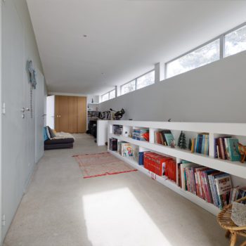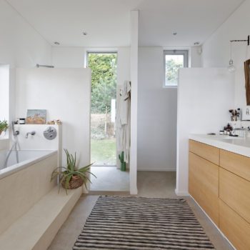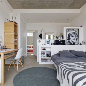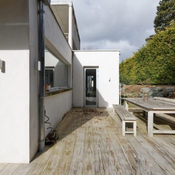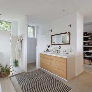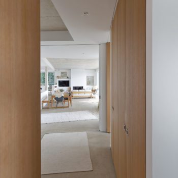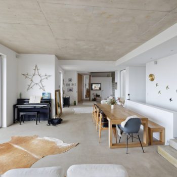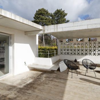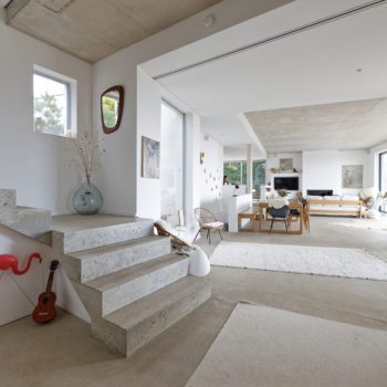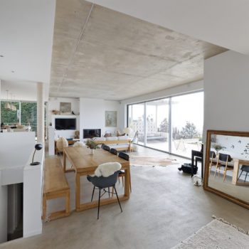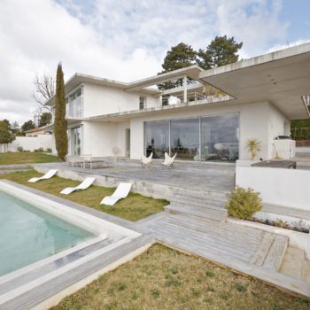 Du béton du sol au plafond, des murs blancs, de larges baies vitrées qui ouvrent cette maison d’architecte des années 70 entièrement revisitée, sur l’extérieur où le jardin et les divers espaces aménagés avec vue, accueille un bassin de nage.
