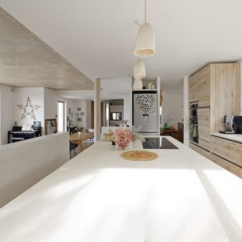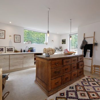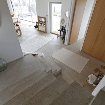 sol béton, baie vitrée, cuisine ouverte, rénovation, escalier, cheminée, salle de bain, carrelage/tomettes, luminosité