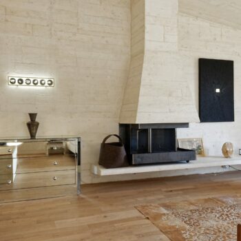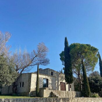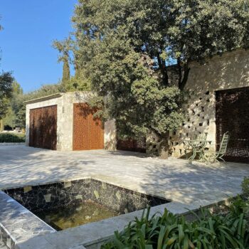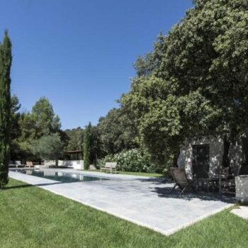 This very impressive architect-designed house offers extraordinary volumes for the living rooms, quality finishes, beautiful materials and carefully selected designer furniture. Set in the Provençal countryside, with its local stone façade, it blends perfectly into the landscaped setting where the different areas, terraces and swimming pool, umbrella pines, cypresses and olive trees blend elegantly together.