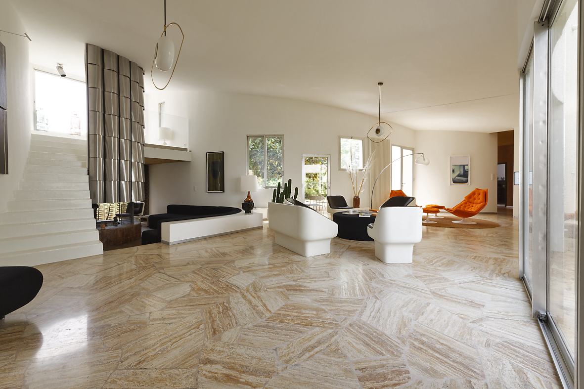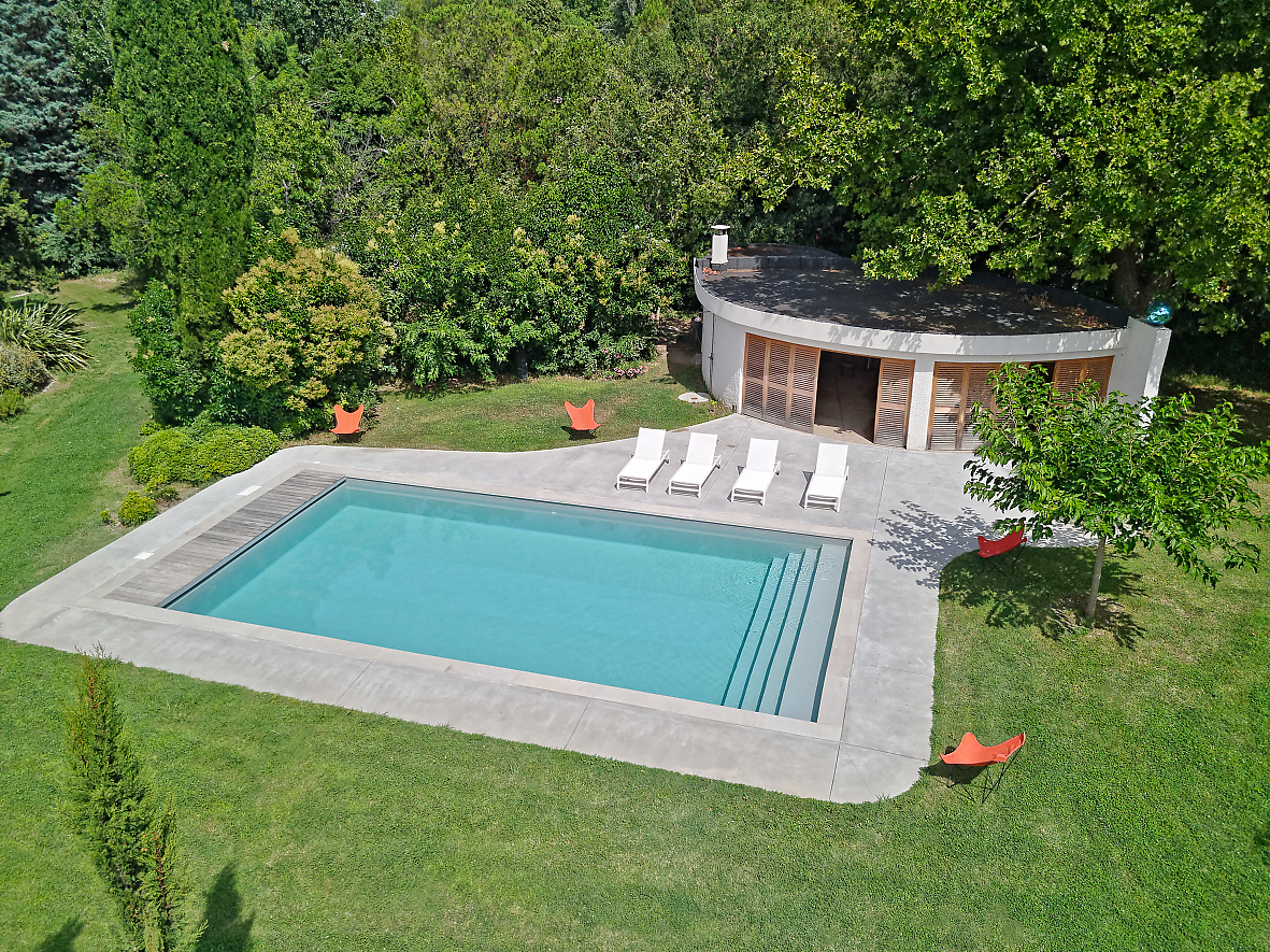 Maison d’architecte des années 70 en parfait état près d’Arles. A l’intérieur, de belles pièces de vie et des chambres lumineuses, avec le mobilier design d’origine, des matériaux de qualité, des murs et éléments de formes courbes qui donnent de la fluidité aux différents volumes. A l’extérieur, une façade blanche, un jardin aménagé, arboré et verdoyant, avec de larges espaces de pelouse, une piscine avec une large terrasse et pool house aux formes arrondies.