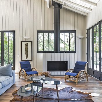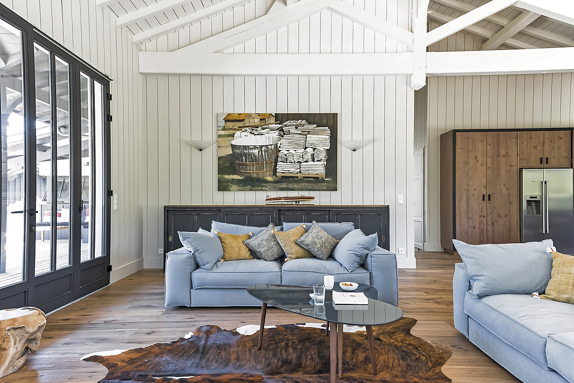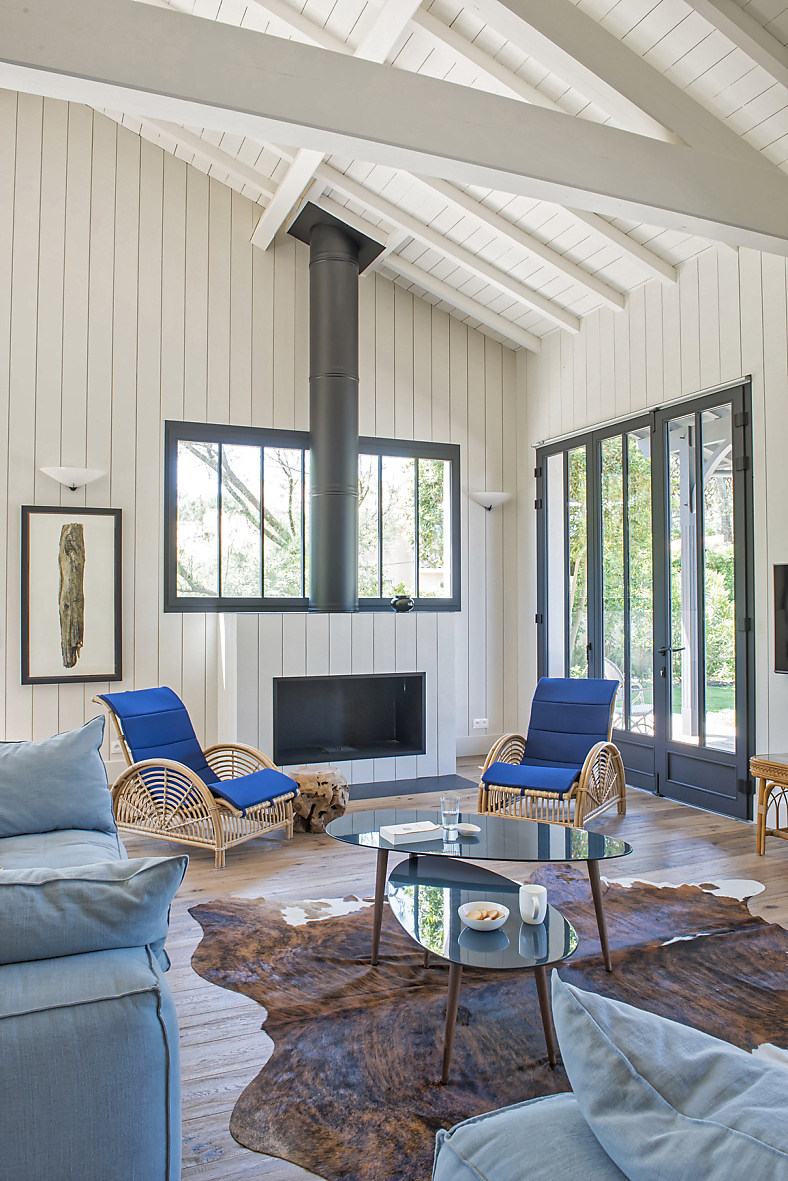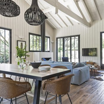 Maison en bois récente au Cap Ferret. De belles pièces de vie lumineuses, avec de grandes ouvertures, du mobilier vintage recherché. Des chambres spacieuses, à la décoration soignée et aux murs peints colorés