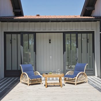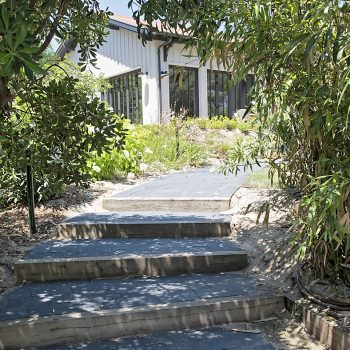 A l’extérieur, le bardage bois peint en blanc apporte de la lumière. une large terrasse en bois entoure la piscine.