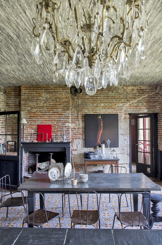 Moulures, parquet, briques et carreaux de ciment.