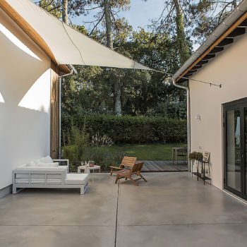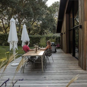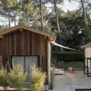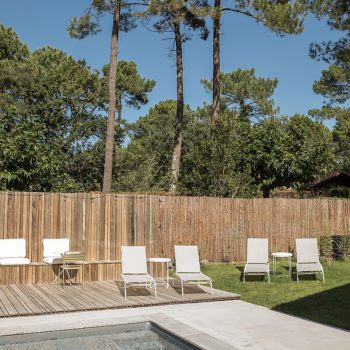 It is a feeling of lightness and serenity that invades you when you discover this elegant house surrounded by pine trees. From the bright living rooms to the 6 cocoon rooms, we find simple and raw materials to which blends tastefully a sober and minimalist decoration. the wooden terrace connects the different spaces and hosts a swimming pool in a landscaped garden