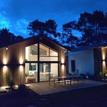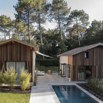 Elégante maison au milieu de pins. Des pièces de vie lumineuses et 6 chambres, on retrouve des matériaux simples et bruts. La terrasse en bois fait le lien entre les différents espaces et accueille une piscine dans un jardin aménagé.