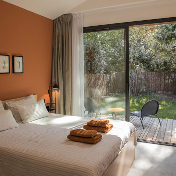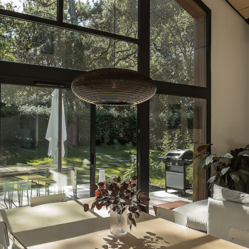It is a feeling of lightness and serenity that invades you when you discover this elegant house surrounded by pine trees. From the bright living rooms to the 6 cocoon rooms, we find simple and raw materials to which blends tastefully a sober and minimalist decoration. the wooden terrace connects the different spaces and hosts a swimming pool in a landscaped garden
