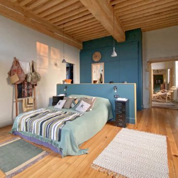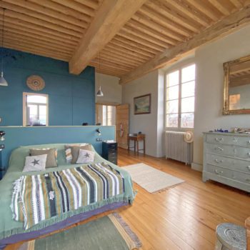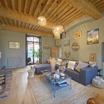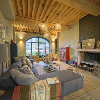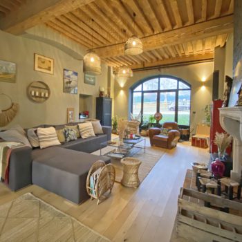 Golden stone house in the Lyon region. Charming facade in local stone for this pretty house renovated with great taste and simplicity. A concrete floor, painted walls, golden stones, natural wood, furniture and objects chosen with care that can be found in the different areas of the house, give character to this elegant house which, with its green garden and swimming pool, fits perfectly into the surrounding countryside.