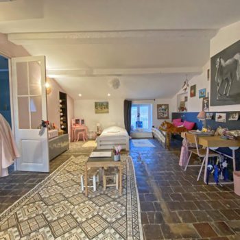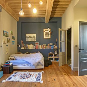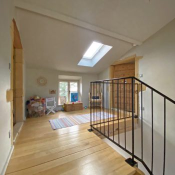 escalier, sol béton, ancien, baie vitrée, rénovation, cheminée, salle de bain, parquet, murs peints couleurs