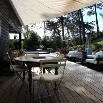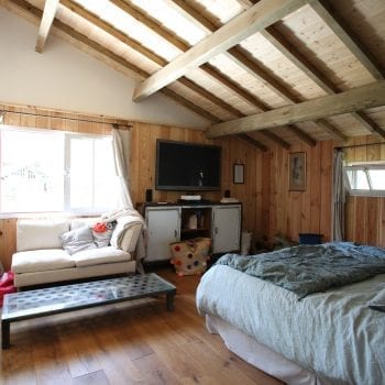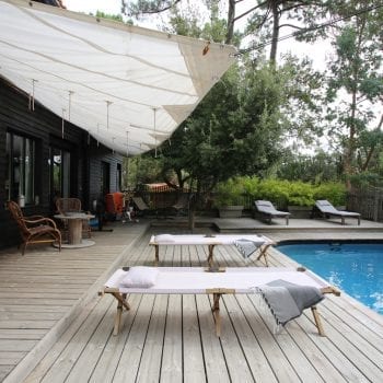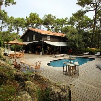 Maison en bois située sur le bassin d’Arcachon. Des pièces de vie en bois clair et murs blancs avec de beaux volumes éclairées par une grande verrière,, une décoration contemporaine soignée, des chambres spacieuses. A l’extérieur, au milieu des pins, une façade en bois foncé, une belle terrasse en bois, une piscine, des auvents aménagés, un jardin verdoyant, arboré.