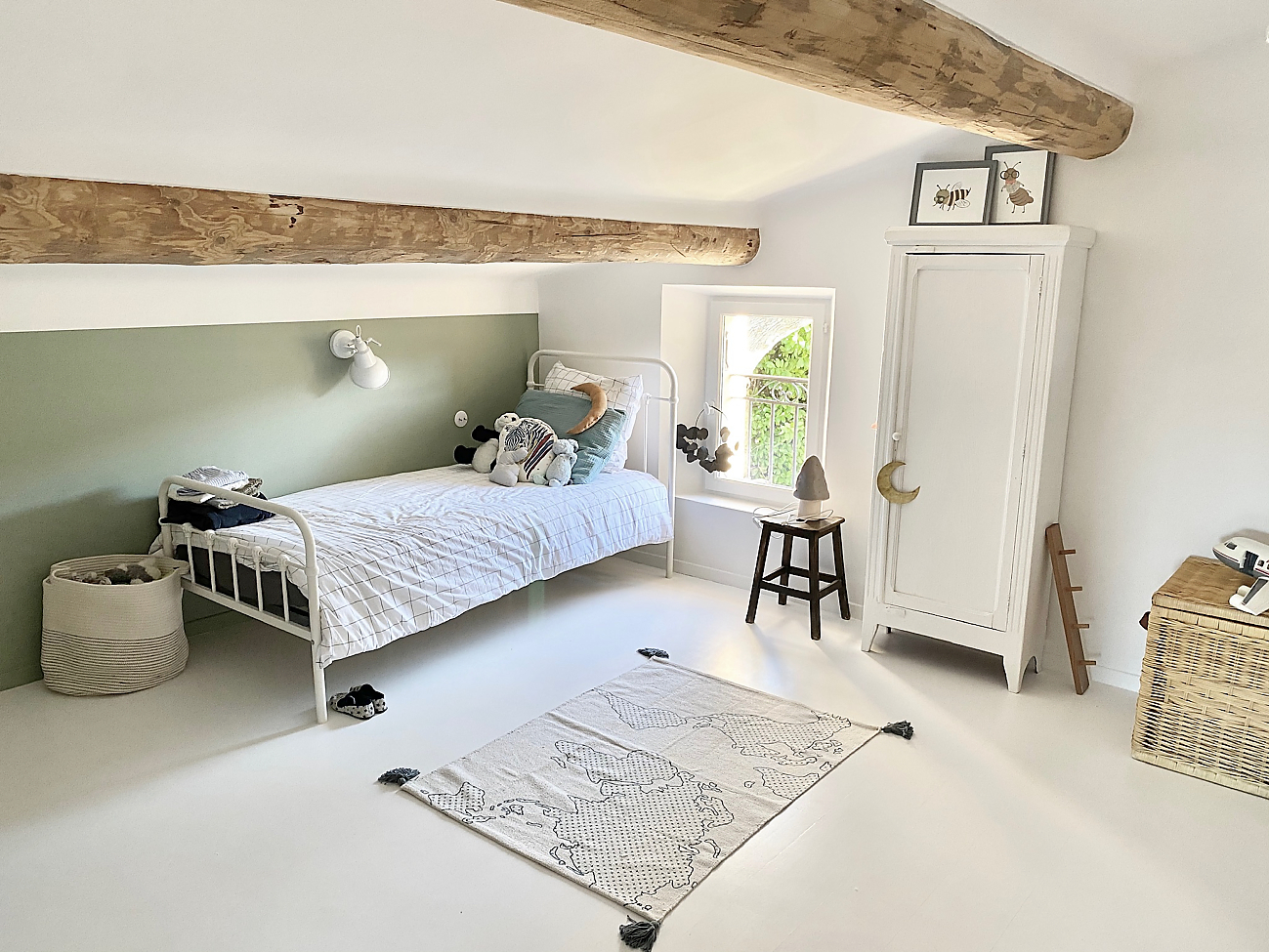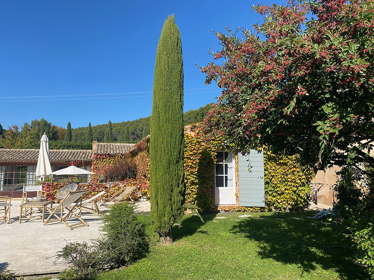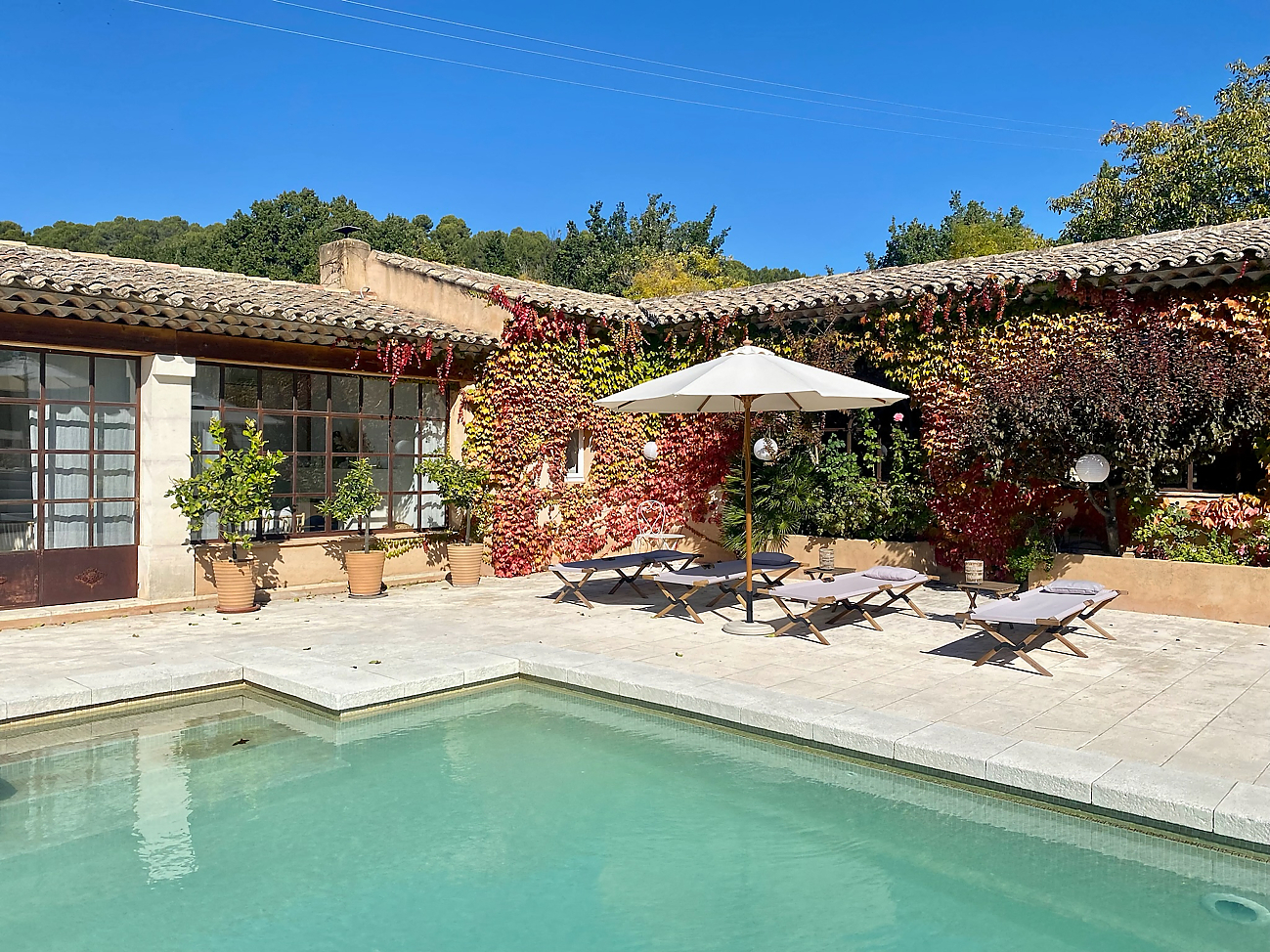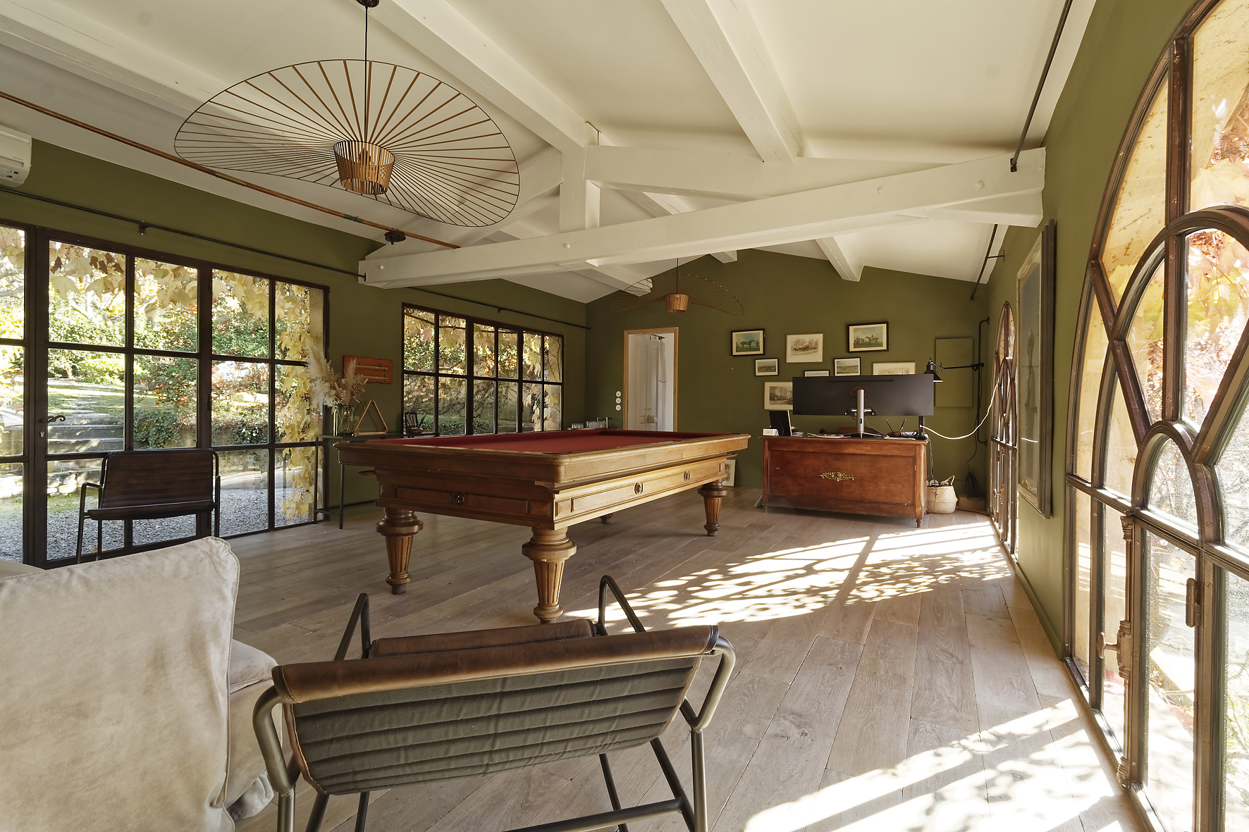 Bohemian spirit farmhouse at the gates of Aix en Provence. Lots of space and light for this renovated farmhouse which keeps traces of its beautiful Provencal origins, beams, floor tiles, fireplaces harmoniously associated with a decoration and vintage furniture carefully found by the owner, painted walls, parquet floor, living rooms with many bedrooms. A billiard room, a large orangery with multiple windows opening onto a vast terrace, surrounds a large swimming pool which is integrated into a large landscaped park of 2 hectares which hosts an olive field, chickens and a tennis court…