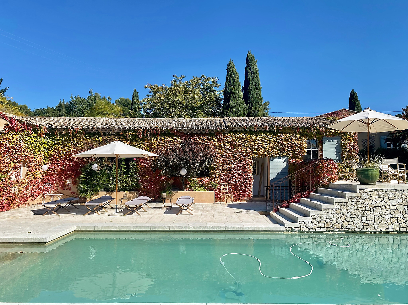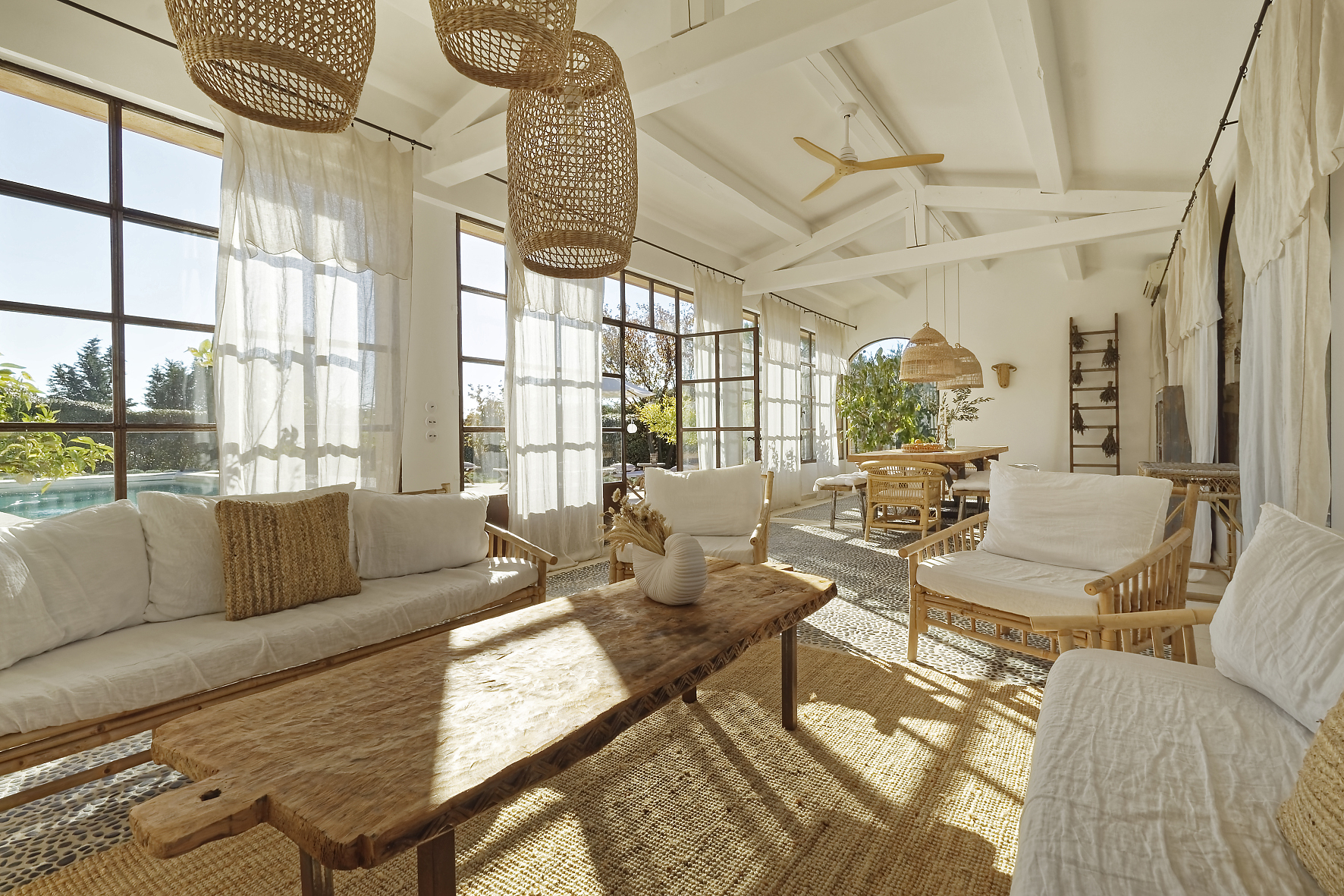 Mas esprit bohème aux portes d’Aix en Provence. Beaucoup d’espace et de lumière pour ce mas rénové. Poutres, tomettes, décoration et mobilier vintage, murs peints, parquet. Une grande orangerie aux multiples verrières donnant sur une vaste terrasse aménagée, entoure une grande piscine qui s’intègre dans un grand parc paysager de 2 hectares qui accueille un potager, une oliveraie et un tennis…