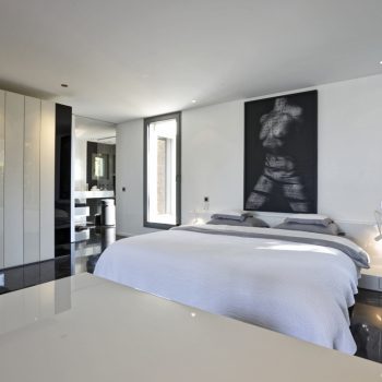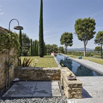 Mas rénové dans le Luberon. A l’intérieur, un mobilier très contemporain et des aménagements minimalistes pour cette maison provençale entièrement repensée. Des matériaux sobres et des murs blancs. De grandes pièces de vie lumineuses ouvertes par de larges baies vitrées. Des chambres spacieuses et claires. A l ‘extérieur, un grand parc aménagé et entretenu, une végétation persistante faite de cyprès, oliviers, typiques du sud. Un impressionnant bassin de nage s’étend longuement dans la perspective de la maison.