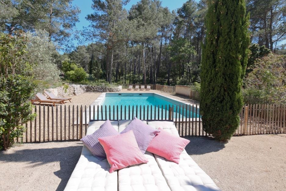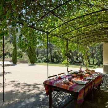 Renovated traditional farmhouse in the heart of the Alpilles. Inside, bright living rooms, sober decoration, spacious rooms in light tones. Outside, a park with trees and landscaped, an awning, vast green areas, a swimming pool, views of the Alpilles.