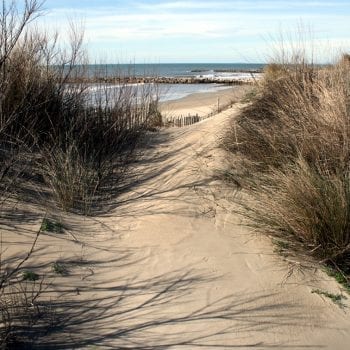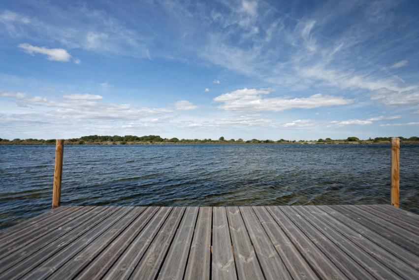 Maison camarguaise en pleine nature. A l’intérieur, décoration simple et fonctionnelle. A l’extérieur, de nombreux espaces différents, plage, pontons en bois, étendue de sable, dune, étendues d’eau, végétation typiquement camarguaise