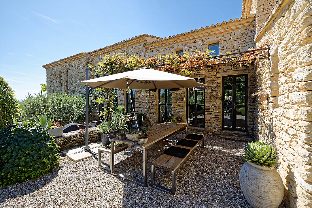 Grand mas rénové à Gordes. A l’intérieur, de très grandes pièces de vie avec une immense verrière et une grande hauteur sous plafond, une mezzanine, avec un aménagement contemporain, des chambres lumineuses. A l’extérieur, une piscine avec terrasse, de nombreux espaces aménagés avec tonnelles, recoins, restantes, façade pierre et un grand parc aménagé et arboré avec une végétation méditerranéenne luxuriante.