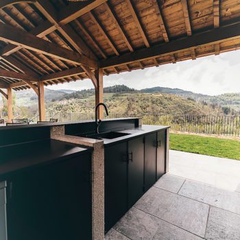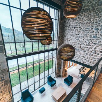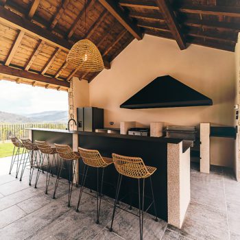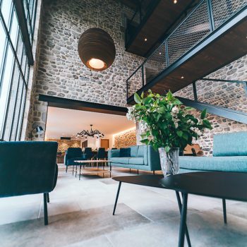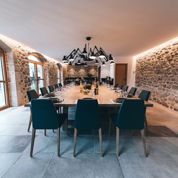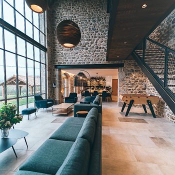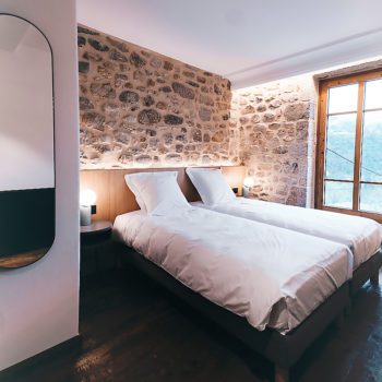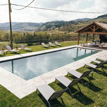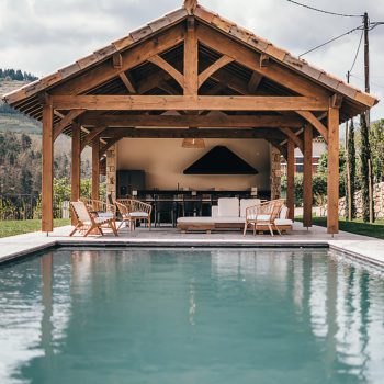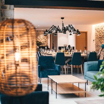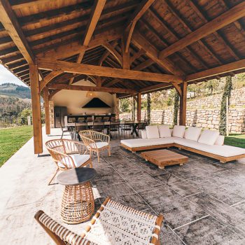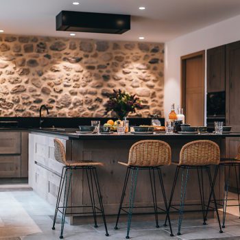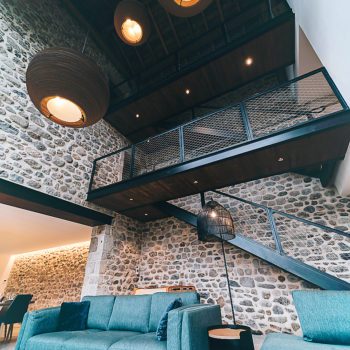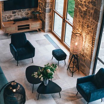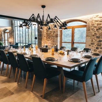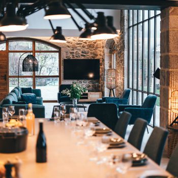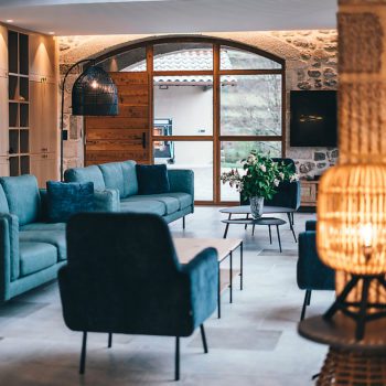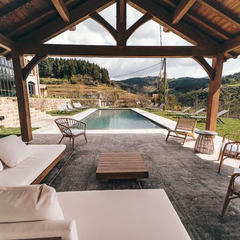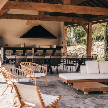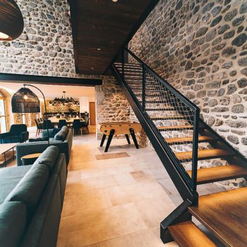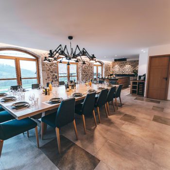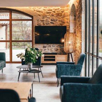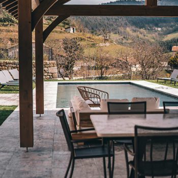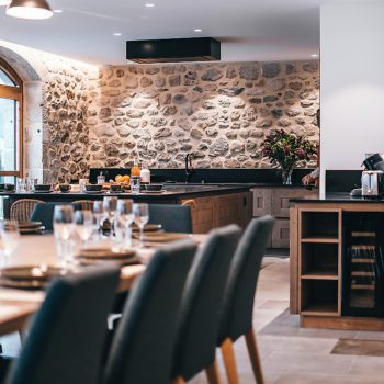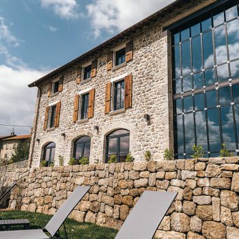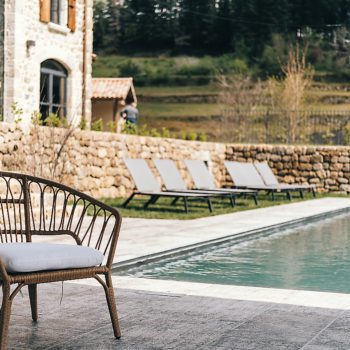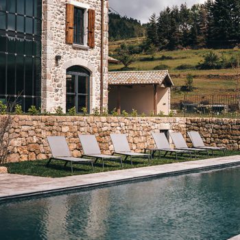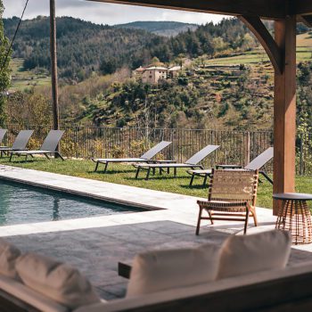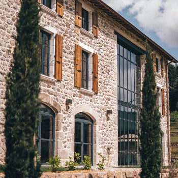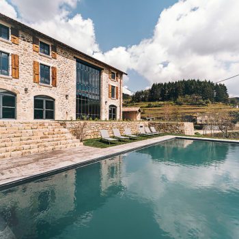 Des volumes étonnants, une très grande hauteur sous plafond, une immense verrière qui grimpe sur la façade en pierre de cette ferme ardéchoise très contemporaine. Des pièces de vie aux nombreuses chambres, on retrouve de beaux matériaux bruts. A l’extérieur, différents espaces aménagés, une piscine avec un très grand auvent qui accueille une cuisine extérieure, un terrain de pétanque…