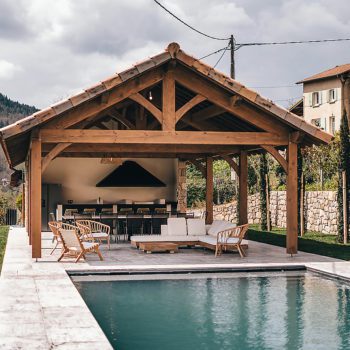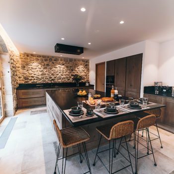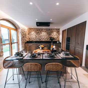 Amazing volumes, a very high ceiling, a huge glass roof that climbs on the stone facade of this Ardèche farmhouse decidedly very contemporary. From the living rooms to the many rooms, you will find beautiful raw materials, furniture and carefully selected decoration. outside, various landscaped areas, a swimming pool with a very large awning, which houses an outdoor kitchen, a petanque…