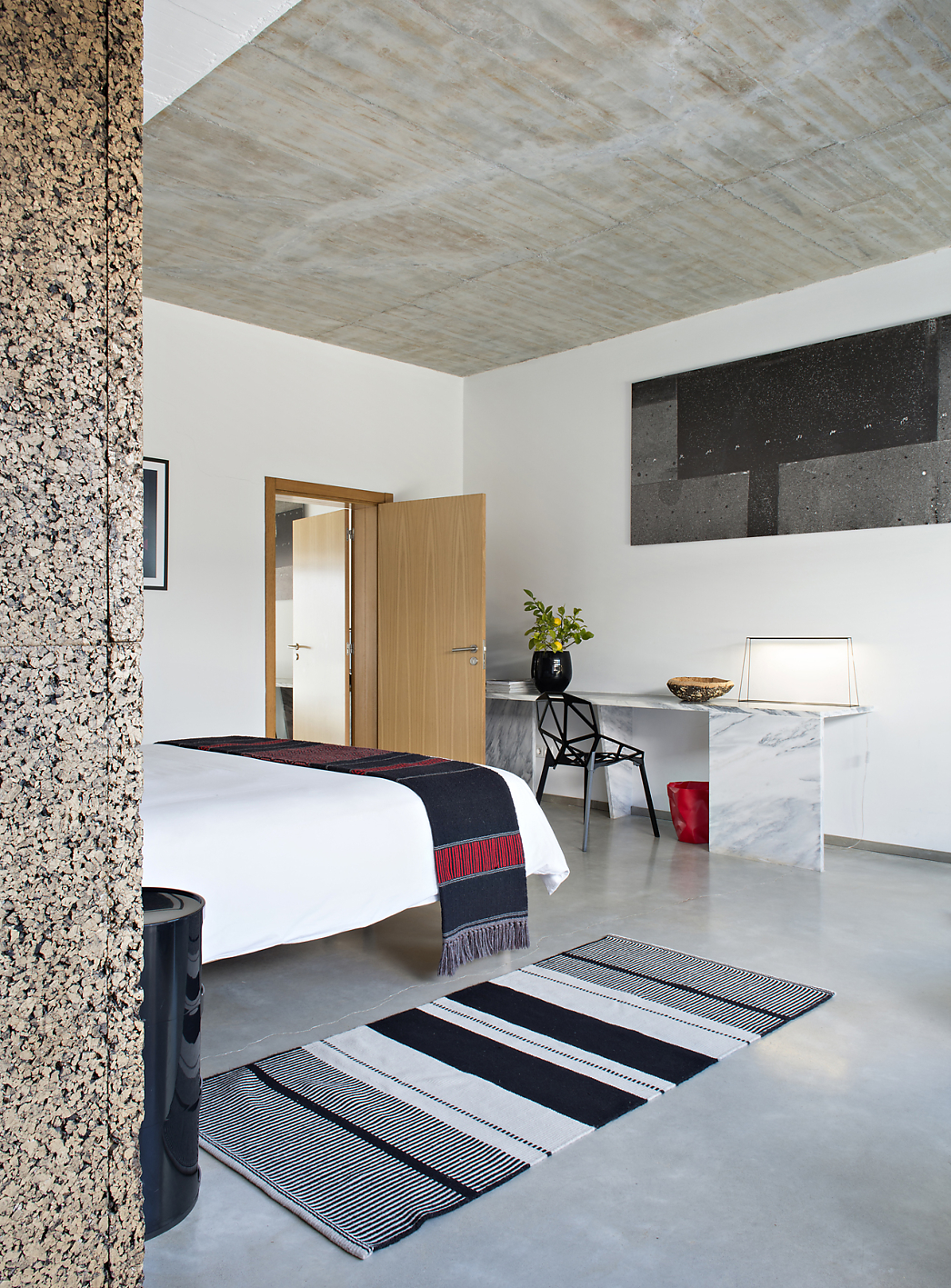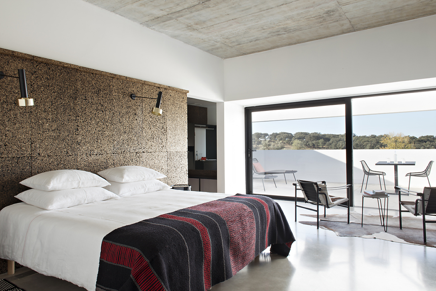 Inspired by villages in the South with walls that have been washed down, the architecture also uses iconic materials: cork and marble.